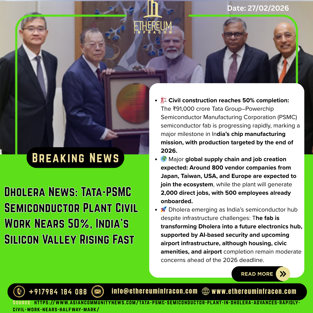 Dholera News: The ₹91,000 crore Tata Group–Powerchip Semiconductor Manufacturing Corporation semiconductor plant at Dholera Special Investment Region has reached 50% civil construction completion. The project is progressing rapidly and is expected to begin chip production by 2026, transforming Dholera into India’s major semiconductor and technology hub.