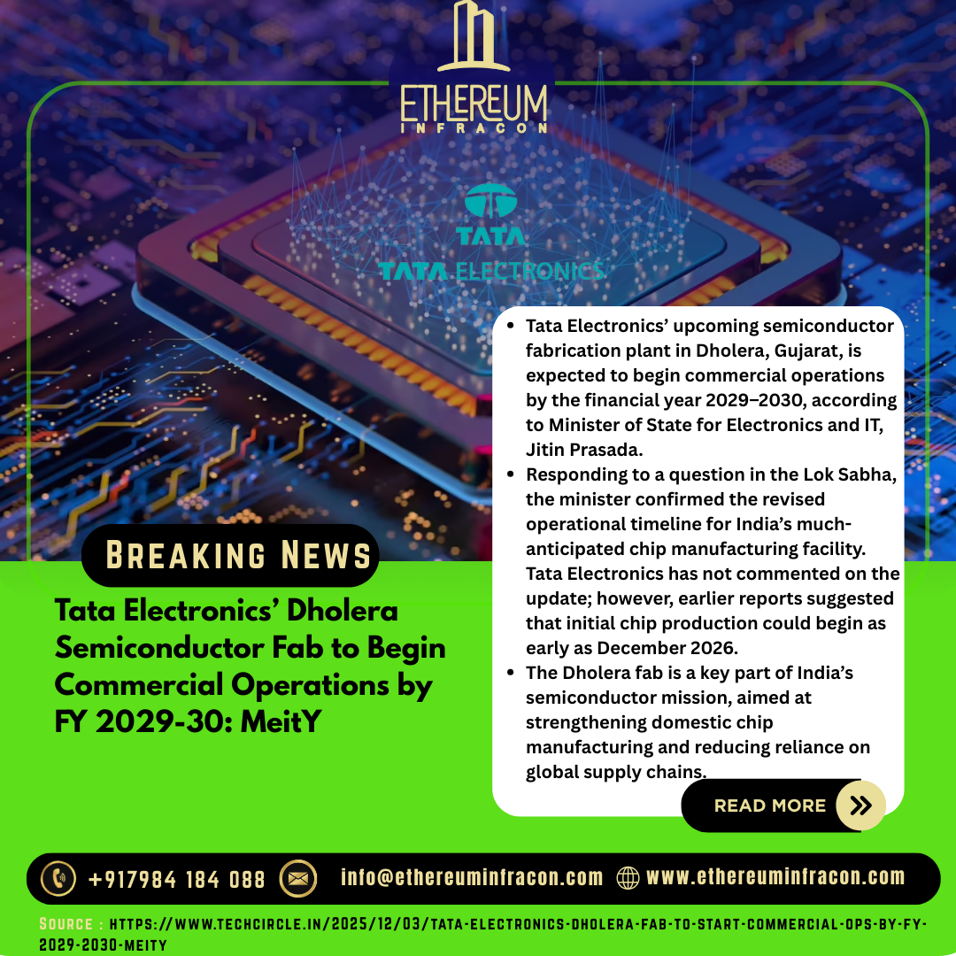 A major Dholera update reveals that Tata’s semiconductor fab is set to begin operations by FY 2029–30. Discover how this Tata semiconductor Dholera update is powering India’s rise in the global chip industry.the latest Dholera news!