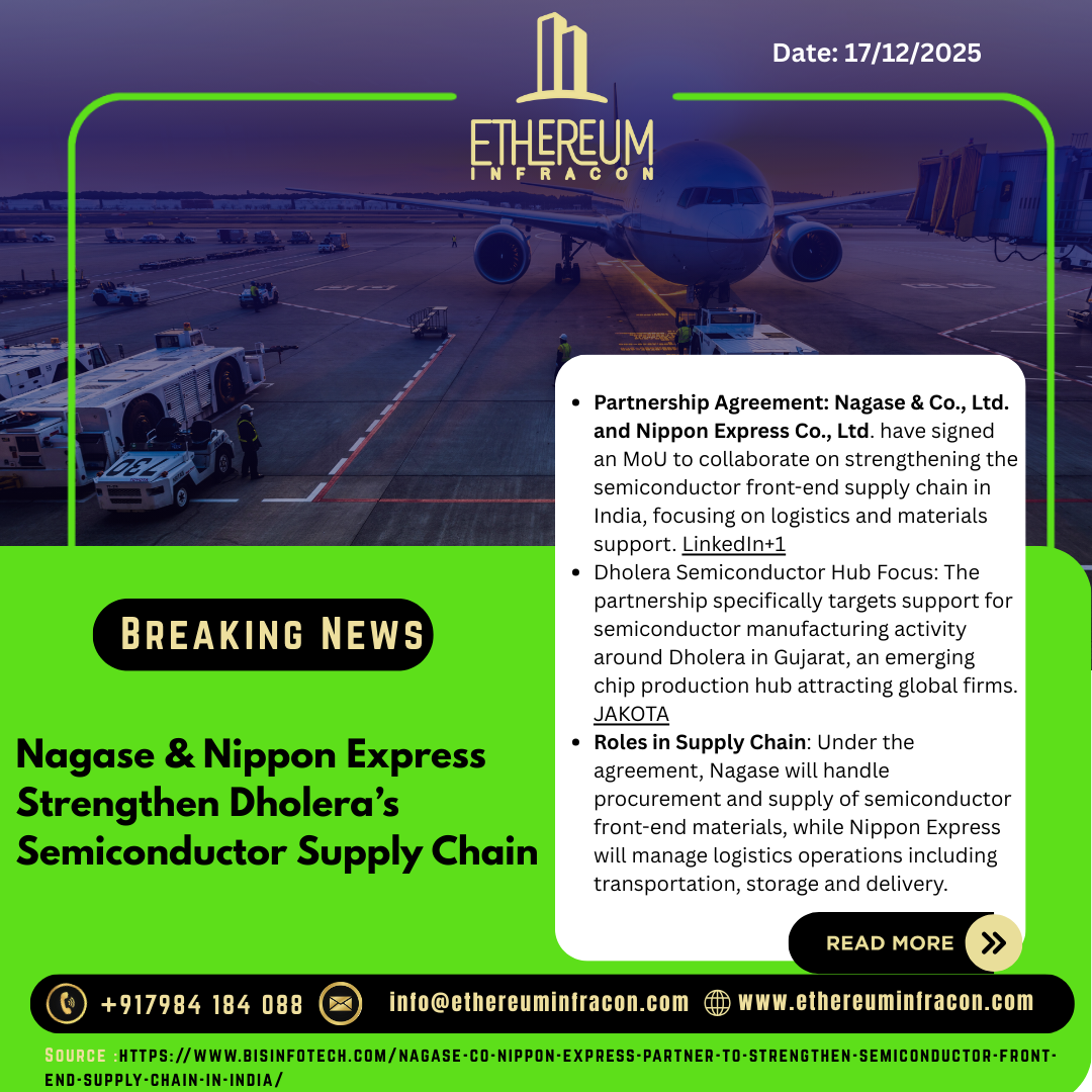 Nagase & Co., Ltd. and Nippon Express (NX Group) have partnered to strengthen India’s semiconductor front-end supply chain, with a key focus on the Dholera semiconductor hub in Gujarat. The collaboration will ensure efficient sourcing of materials and seamless logistics support for upcoming chip manufacturing projects, boosting India’s semiconductor ecosystem.