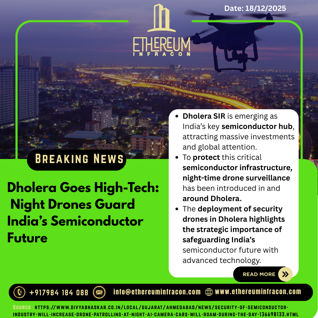 Dholera is emerging as one of India’s safest smart cities with the deployment of night-vision drone surveillance to protect its semiconductor and industrial zones. Advanced drone guards and smart security systems ensure round-the-clock safety, strengthening Dholera’s position as a secure and future-ready city.