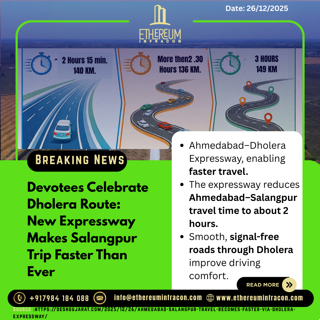 The new Ahmedabad–Dholera Expressway is transforming travel for devotees by reducing the Ahmedabad to Salangpur Hanumanji journey to nearly 2 hours. Passing through Dholera Smart City, the smooth, signal-free road offers a faster, safer, and more comfortable drive compared to older routes.