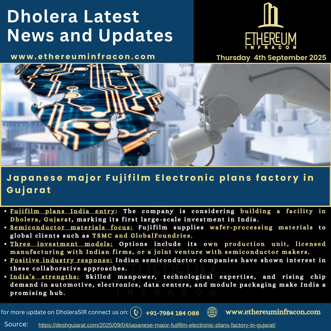 "Fuji Film investment in Dholera is set to boost India’s semiconductor industry, with the company planning its first major facility in Gujarat to meet rising chip demand."