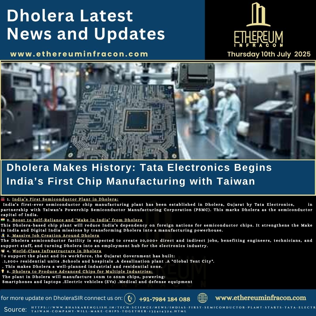 India’s first semiconductor plant by Tata Electronics and Taiwan’s PSMC has started in Dholera, Gujarat. This landmark project boosts self-reliance, creates 20,000+ jobs, and positions Dholera as India’s emerging global tech and manufacturing hub.
