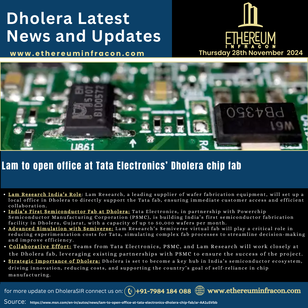 Latest Dhoelra News Lam Research, a leading supplier of wafer fabrication equipment, will set up a local office in Dholera to directly support the Tata fab, ensuring immediate customer access and efficient collaboration.